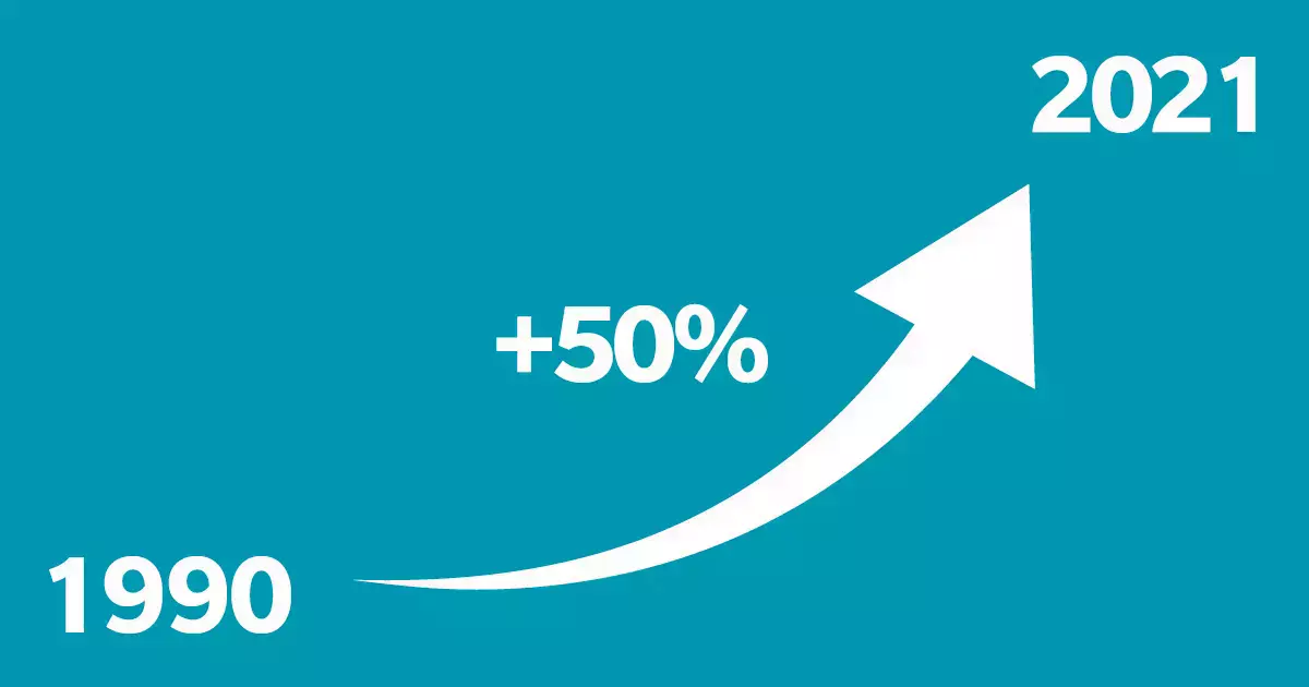 В период с 1990 по 2021 год влияние долгоживущих парниковых газов (ПГ) на потепление нашего климата увеличилось почти на 50%, причем на долю CO2 приходится около 80% этого увеличения.