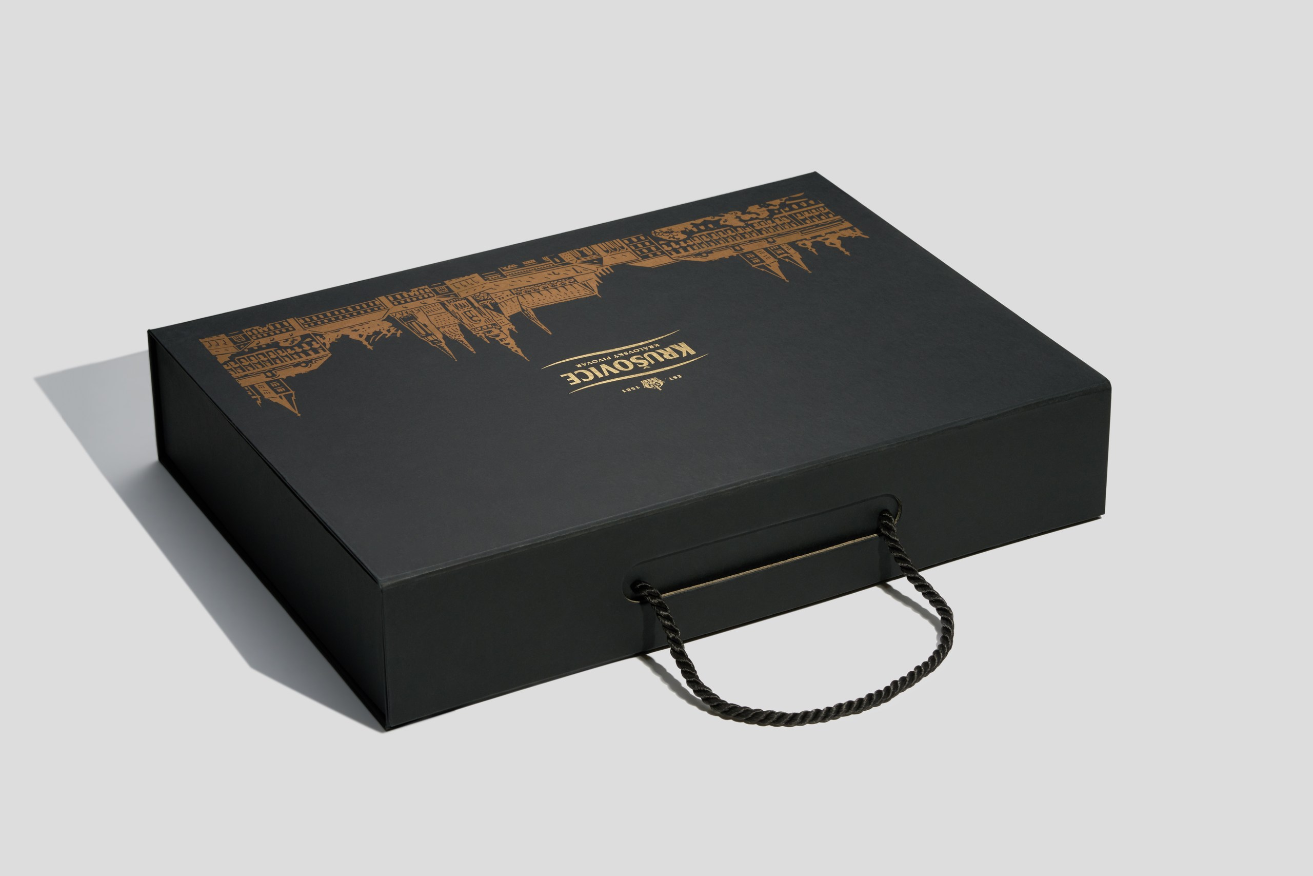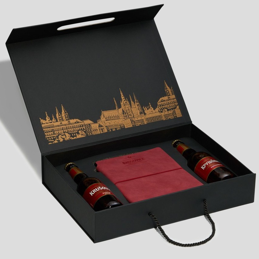 Для бренда Krušovice мы разработали эксклюзивный новогодний набор, который стал воплощением элегантности и традиций. Подарочная коробка выполнена в минималистичном черном дизайне с золотым тиснением, изображающим архитектурные символы Чехии, что подчеркивает богатую историю бренда.