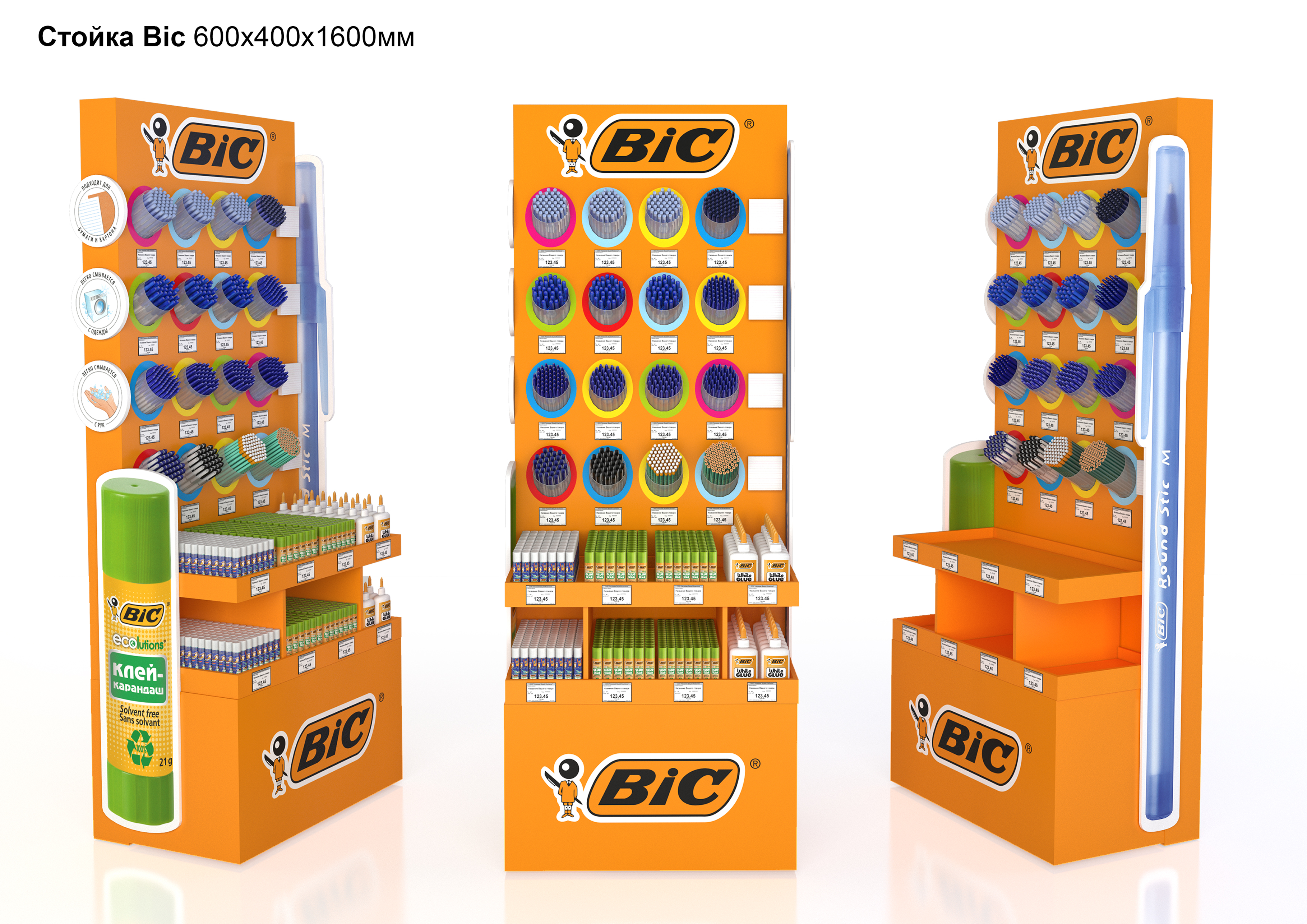 Для бренда BIC был разработан функциональный и яркий напольный дисплей, решающий задачу демонстрации продукции поштучно — сложный формат, требующий особого подхода.