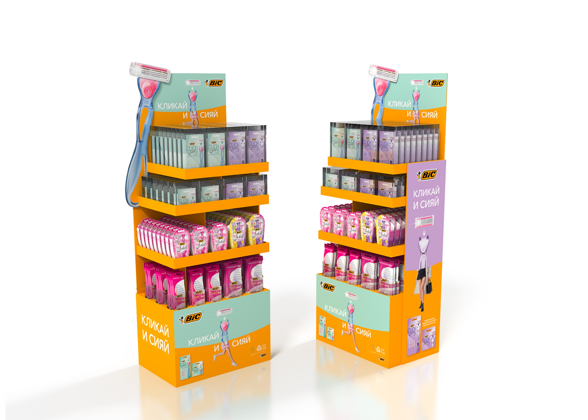 Яркий, солнечный и лёгкий — именно таким получился летний дисплей BIC, созданный для продвижения женских бритв в сезон активных продаж. В центре конструкции — динамичный стерео-варио топпер, который эффектно передает слоган летней промо-кампании «Кликай и сияй».